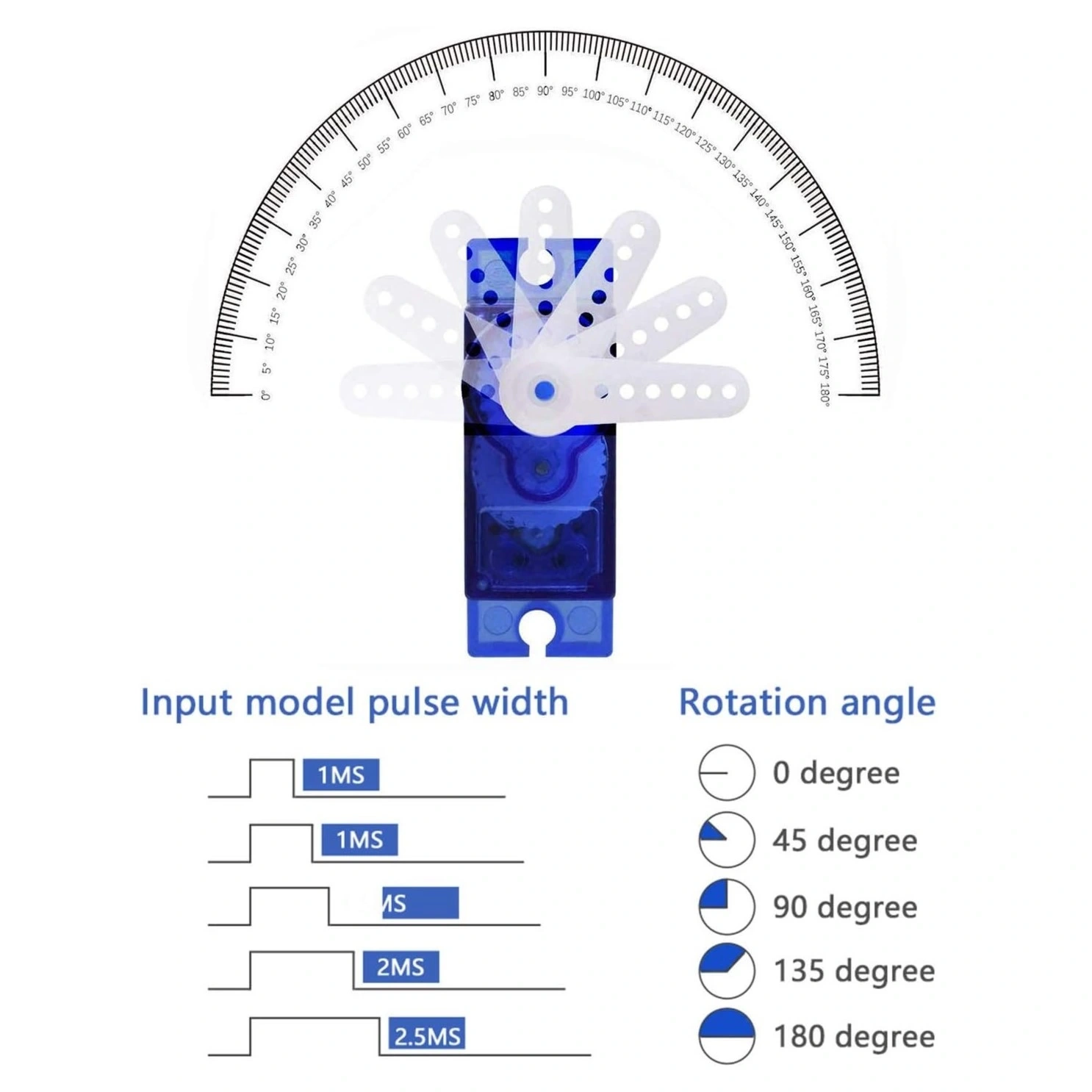 SG90 servo motor standart olarak 180 derece dönüş açısına sahiptir. 0° ile 180° arasındaki herhangi bir konuma hassas şekilde konumlandırılabilir.