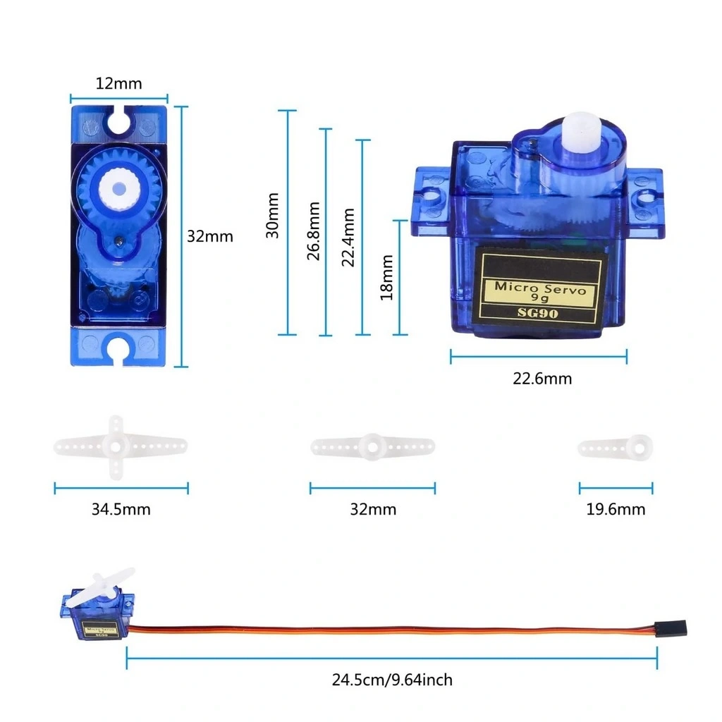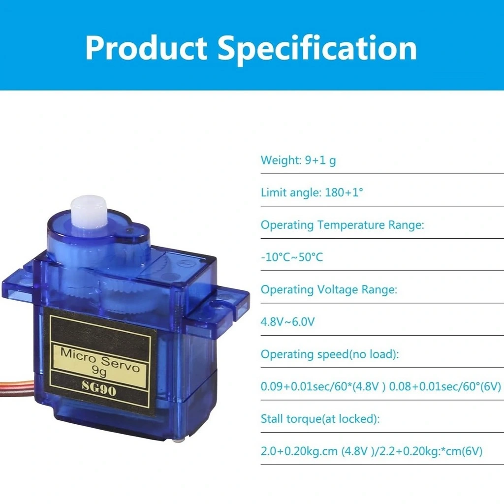 SG90, 9g ağırlığında mikro servo motor olup hassas açı kontrolü gerektiren robotik projelerde, RC modellerde ve mekatronik uygulamalarda kullanılır.