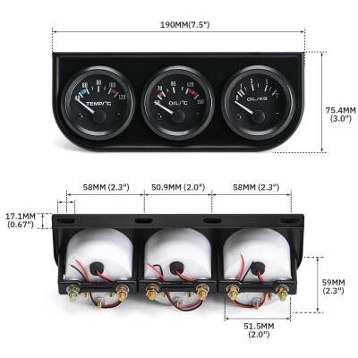 Sıcaklık - Yağ Sıcaklığı - Yağ Miktarı 3\\\'lü Gösterge Paneli. Genellikle otomotiv sektöründe, araçlarda, teknelerde ve karavanlarda tercih edilen bir üründür. Ürünün üzerinde 3 adet ışıklı gösterge bulunmaktadır. Bunlar Su sıcaklığı, yağ sıcaklığı ve yağ basıncı göstergeleridir. Panel kasası metaldir.