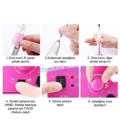 Ürünün kullanımı için üçüncü fotoğrafta yer alan talimatları sırasıyla uygulayabilirsiniz. Ürünün motoru üzerine uç takıldığı zaman çalışmaktadır. Bu nedenle çalıştırmadan önce lütfen kullanacağınız ucu motora bağlayınız ve daha sonar çalıştırınız.