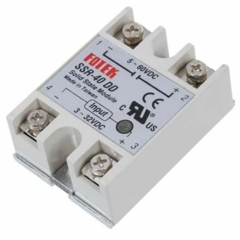SSR-40DD Solid State Röle 40A Fotek SSR-40DD 40 Amper Solid State (Relay) röle. Solid state röleler kullanıldıkları yerlerde klasik röleler yada kontaktörler gibi çalışırlar. Yarı iletken devreden oluşmaları nedeniyle, mekanik kontak çıkışına sahip diğer ürünlere göre daha uzun ömürlü ve dayanıklıdırlar. Fotek Solid State Röle DC 3-32 volt arası besleme ile tetik alan bu ürün DC 5-60V elektriği anahtarlayabilir. Ayrıca Arduino ve Raspberry Pi gibi programlama kartları ile birlikte uyumlu çalışabilmektedir. Tüm Solid State Röle çeşitlerine buradan ulaşabilirsiniz. Özellikler: Model: SSR-40 DD Kontrol Modu: DC-DC Yük Gerilimi: 5-60VDC Yük Akımı: 40A Kontrol Gerilimi: 3-32VDC Çalışma Göstergesi: LED Kapama Voltajı: <3.5 VDC Tetikleme Akımı: Max. 12.0 mA Kontrol Methodu: Zero cross switching Sızıntı Akımı: Max. 5 mA Tepki Süresi: Max. 8.3 ms ( 60 Hz) Giriş Voltaj Bağışıklığı: 2 KV (EN61000-4-4) İzolasyon Gücü: 4 KVrms (EN60950/VDE0805) Yalıtım Gücü: 100MΩ / 500VDC (EN60950/VDE0805) Kaplama Malzemesi: ABS (UL:94V0) Ortam Şartları: -40°C ~ +80°C;35~85%RH Fotek SSR Datasheet.