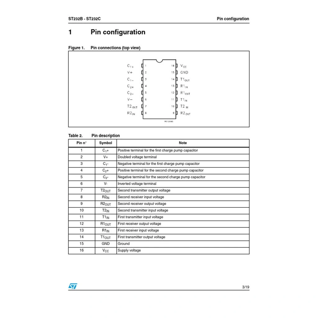 ST232CN DIP-16 entegresinin pin yerleşimi ve işlevleri.