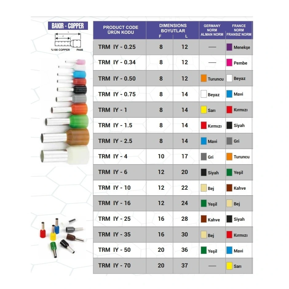 Yüksek kaliteli bakır malzemeden üretilen bu kablo uçları ve yüksükleri, elektrik tesisatları, kontrol panelleri ve cihaz bağlantılarında güvenli iletkenlik sağlar.