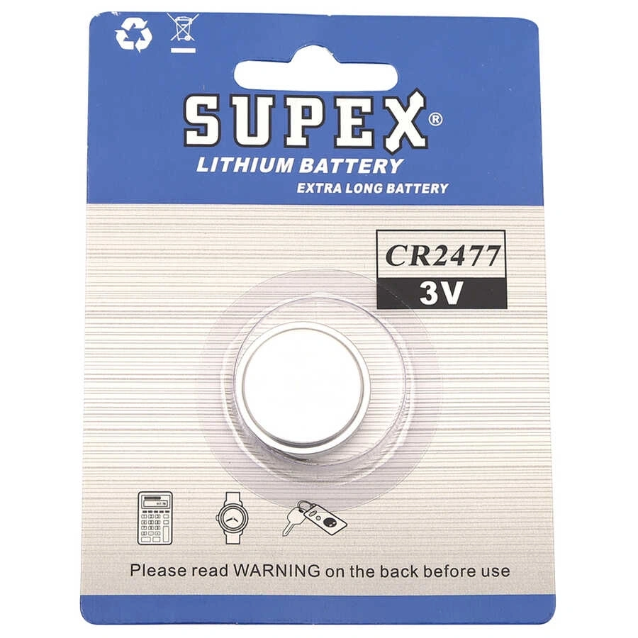 • Supex CR2477, yüksek enerji yoğunluğu ve uzun kullanım ömrü gerektiren elektronik cihazlar için üretilmiş güvenilir bir lityum düğme pildir.