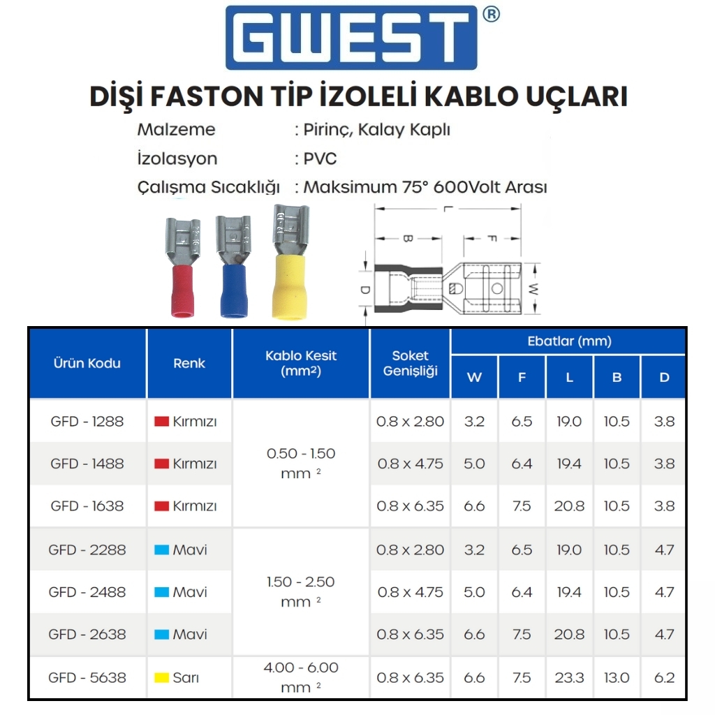 GFFD-2638 tam izoleli dişi faston kablo ucu, 1.50 mm² ile 2.50 mm² arası kablolar için güvenli ve hızlı bağlantı çözümü sunar. PVC izolasyonu sayesinde kısa devre riskini en aza indirir ve kullanıcıya maksimum güvenlik sağlar. Hızlı bağlantı ve sökme gerektiren devrelerde yaygın olarak kullanılır.