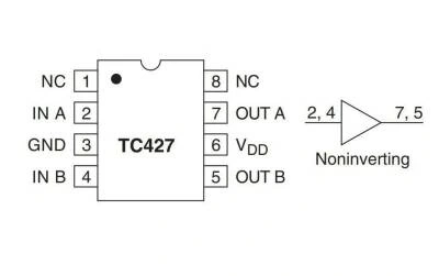 TC427, çift CMOS yüksek hızlı sürücüdür. Bir TTL / CMOS giriş Voltaj seviyesi, raydan raya çıkış Voltaj seviyesi salınımına çevrilir. CMOS çıkışı 25mV toprak veya pozitif besleme dahilindedir. Düşük empedanslı, yüksek akım sürücü çıkışları 30ns'de 1000pF 18V yükü sallar. Benzersiz akım ve gerilim sürücü özellikleri, TC426 / TC427 / TC428'i ideal güç MOSFET sürücüleri, hat sürücüleri ve DC-DC dönüştürücü yapı taşları yapar.
