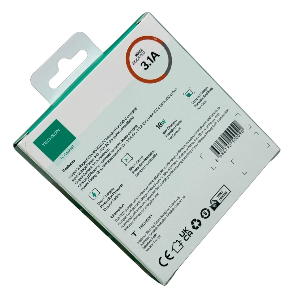 TECHSON 18W Hızlı Şarj Adaptörü + Type-C Kablo S10A18T, akıllı telefonlar, tabletler ve diğer USB-C cihazlar için tasarlanmış kompakt ve güçlü bir şarj çözümüdür. Adaptör ve kablo seti, günlük kullanımda hızlı ve güvenli şarj imkanı sağlar.