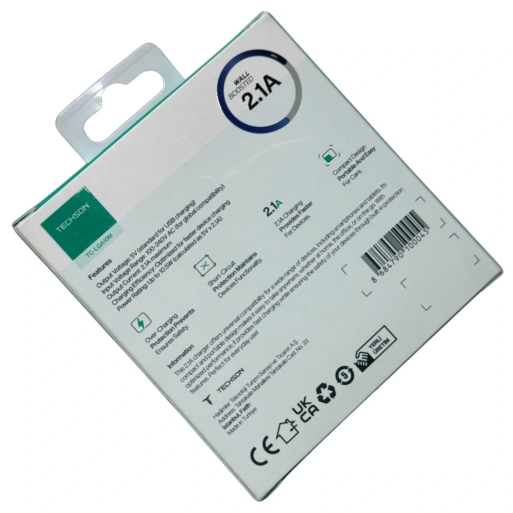 TECHSON 2.1A Micro USB Şarj Cihazı, Android ve birçok akıllı cihaz için tasarlanmış güvenilir ve hızlı şarj çözümüdür. 2.1A çıkış gücü sunan bu kompakt adaptör, cihazlarınızı standart cihazlara göre daha hızlı şarj eder.