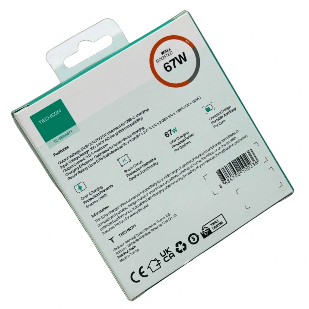 TECHSON 67W Type-C Hızlı Şarj Cihazı MI11A67T'nin detaylı teknik özellikleri aşağıda listelenmiştir.