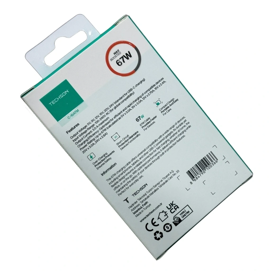Techson markasının dayanıklı tasarım anlayışıyla üretilen C-16ATM model kablo, dizüstü bilgisayarlardan akıllı telefonlara kadar geniş bir cihaz yelpazesi için 67W'a varan güç desteği sunmaktadır.