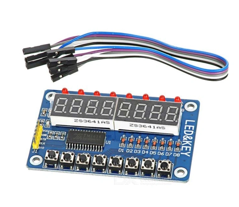 TM1638 Modülü, 8 adet dijital 7-segment LED ekran, 8 adet LED gösterge ve 8 adet butonu tek kart üzerinde birleştiren çok fonksiyonlu bir kontrol ve görüntüleme modülüdür.