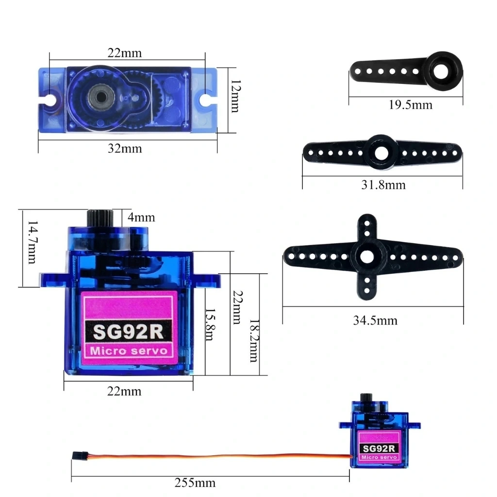 Tower Pro SG92R, RC modelcilik, robotik ve hobi elektroniği projelerinde sıklıkla tercih edilen, kompakt boyutlu ve yüksek performanslı bir micro servo motordur. SG90 modelinin geliştirilmiş bir versiyonu olan SG92R, daha yüksek tork (2.5kg cm) ve dayanıklı metal dişli yapısıyla öne çıkar. 4.8V çalışma voltajında optimum performans sunan bu servo, sadece 9g ağırlığıyla dar alanlara kolayca sığar. RC araçlar, robot kolları, kamera tilt sistemleri ve daha birçok hareketli mekanizma için ideal bir hareket aktarım çözümüdür.