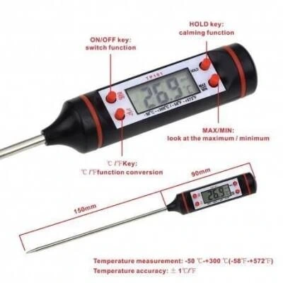 15cm paslanmaz prob uca sahip dijital termometre. Gıda, labaratuvar ve kimya alanlarında kullanıma uygundur. Sıcaklık kolaylıkla ürün üzerinde yer alan ekrandan takip edilebilir.
