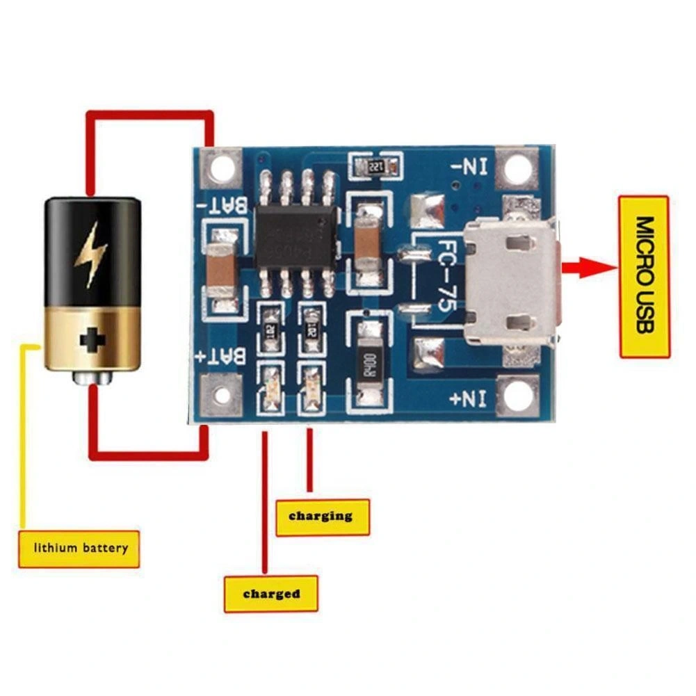 TP4056 Micro USB Girişli Li-Po Pil Şarj Devresi, lityum iyon ve lityum polimer pilleri güvenli şekilde şarj etmek için tasarlanmış kompakt bir modüldür. Kolay kullanımı ve güvenilir tasarımıyla bataryalı projeleriniz için ideal bir seçimdir.