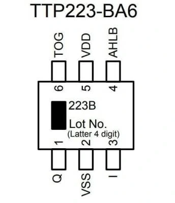 TTP223-BA6/TTP223N-BA6 TonTouchTM, 1 dokunmatik tuş sunan bir dokunmatik yüzey dedektörü IC'dir. Dokunma algılama IC'si, geleneksel doğrudan düğme tuşunu farklı ped boyutuyla değiştirmek için tasarlanmıştır. Düşük güç tüketimi ve geniş çalışma Voltajı, DC veya AC uygulaması için temel iletişim özellikleridir.
