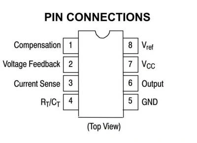 UCx84x serisi kontrol entegre devreleri, minimum sayıda harici bileşenle çevrimdışı veya DC-DC sabit frekanslı akım modu kontrol şemalarını uygulamak için gereken özellikleri sağlar. Dahili olarak uygulanan devreler, 1 mA'dan daha düşük bir başlatma akımına sahip bir düşük gerilim kilitleme (UVLO) ve hata amplifikatör girişinde doğruluk için kesilmiş hassas bir referans içerir. Diğer dahili devreler, mandallı çalışmayı sağlamak için mantık, akım sınır kontrolü de sağlayan bir darbe genişliği modülasyonu (PWM) karşılaştırıcısı ve yüksek tepe akımını kaynaklamak veya batırmak için tasarlanmış bir totem-kutup çıkış aşamasını içerir. N-kanal MOSFET'leri sürmek için uygun olan çıkış katı, kapalı durumda olduğunda düşüktür.