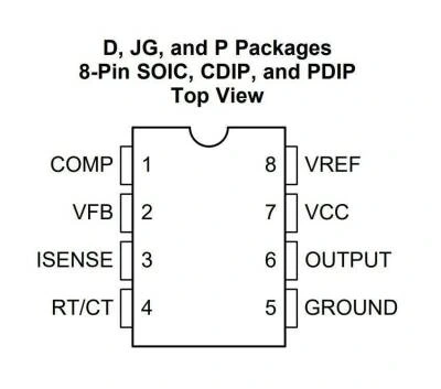 UCx84x serisi kontrol entegre devreleri, minimum sayıda harici bileşenle çevrimdışı veya DC-DC sabit frekanslı akım modu kontrol şemalarını uygulamak için gereken özellikleri sağlar. Dahili olarak uygulanan devreler, 1 mA'dan daha düşük bir başlatma akımına sahip bir düşük gerilim kilitleme (UVLO) ve hata amplifikatör girişinde doğruluk için kesilmiş hassas bir referans içerir. Diğer dahili devreler, mandallı çalışmayı sağlamak için mantık, akım sınır kontrolü de sağlayan bir darbe genişliği modülasyonu (PWM) karşılaştırıcısı ve yüksek tepe akımını kaynaklamak veya batırmak için tasarlanmış bir totem-kutup çıkış aşamasını içerir. N-kanal MOSFET'leri sürmek için uygun olan çıkış katı, kapalı durumda olduğunda düşüktür.