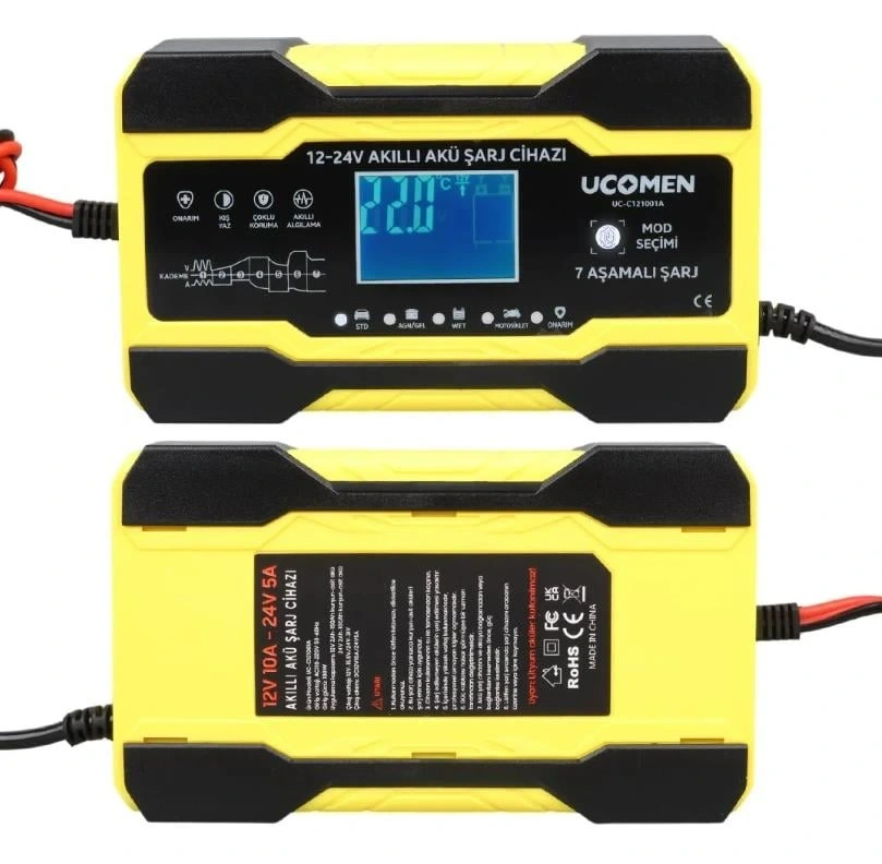 Ucomen markasının bu akü şarj cihazı, 12V ve 24V kurşun-asit ve jel aküler için uygundur. Otomatik voltaj tanıma ve çok kademeli şarj teknolojisi ile ev, atölye ve sanayi uygulamalarında güvenle kullanılır.