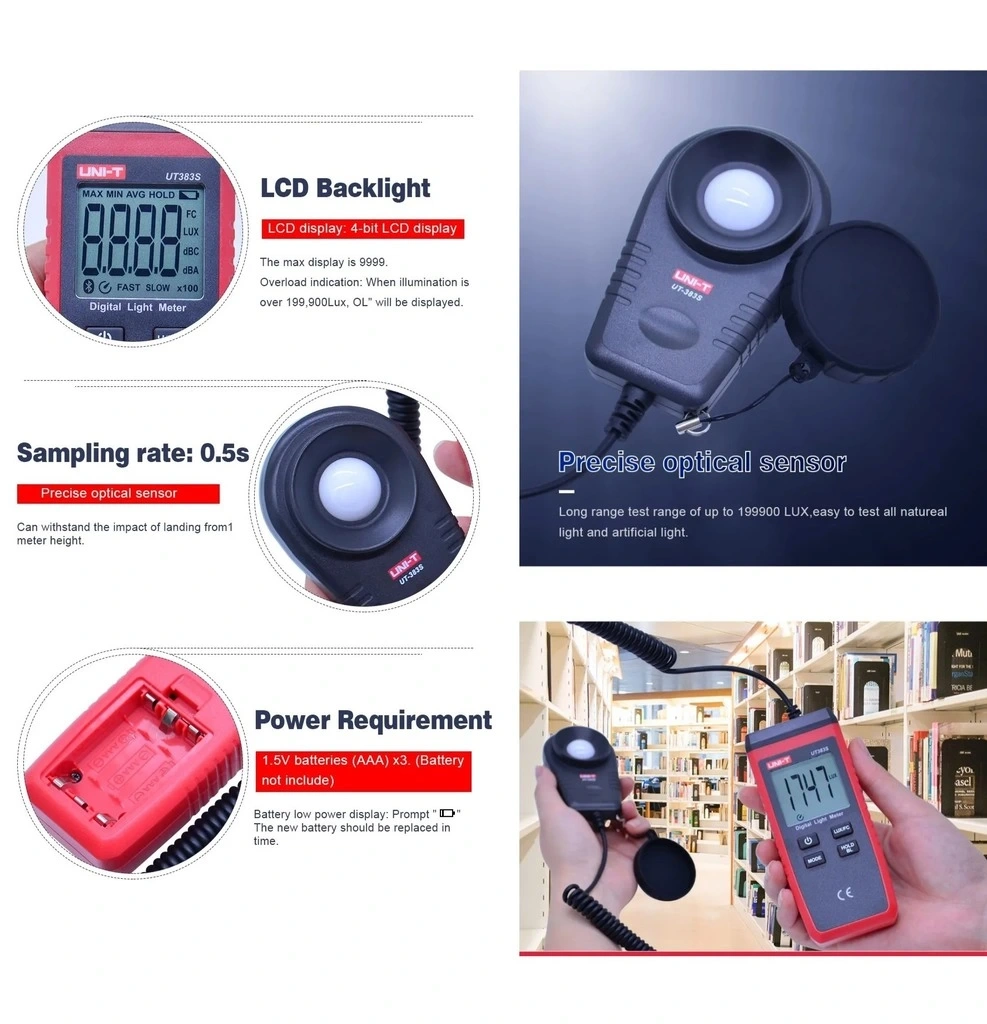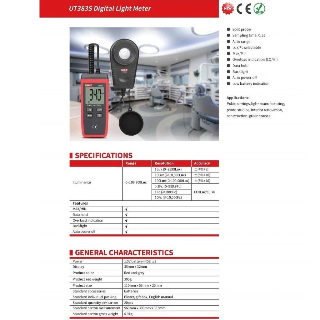 UNI-T UT383S, kompakt boyutlarına rağmen profesyonel ışık ölçüm yetenekleri sunan el tipi mini bir lüxmetredir. Yüksek hassasiyetli silikon fotodiyot sensörü sayesinde, ortamdaki ışık yoğunluğunu lüx veya fc (foot-candle) birimlerinde hızlı ve doğru şekilde ölçebilir. Cep boyutundaki bu cihaz, her yere kolayca taşınabilir ve tek elle kullanılabilir ergonomik tasarıma sahiptir.