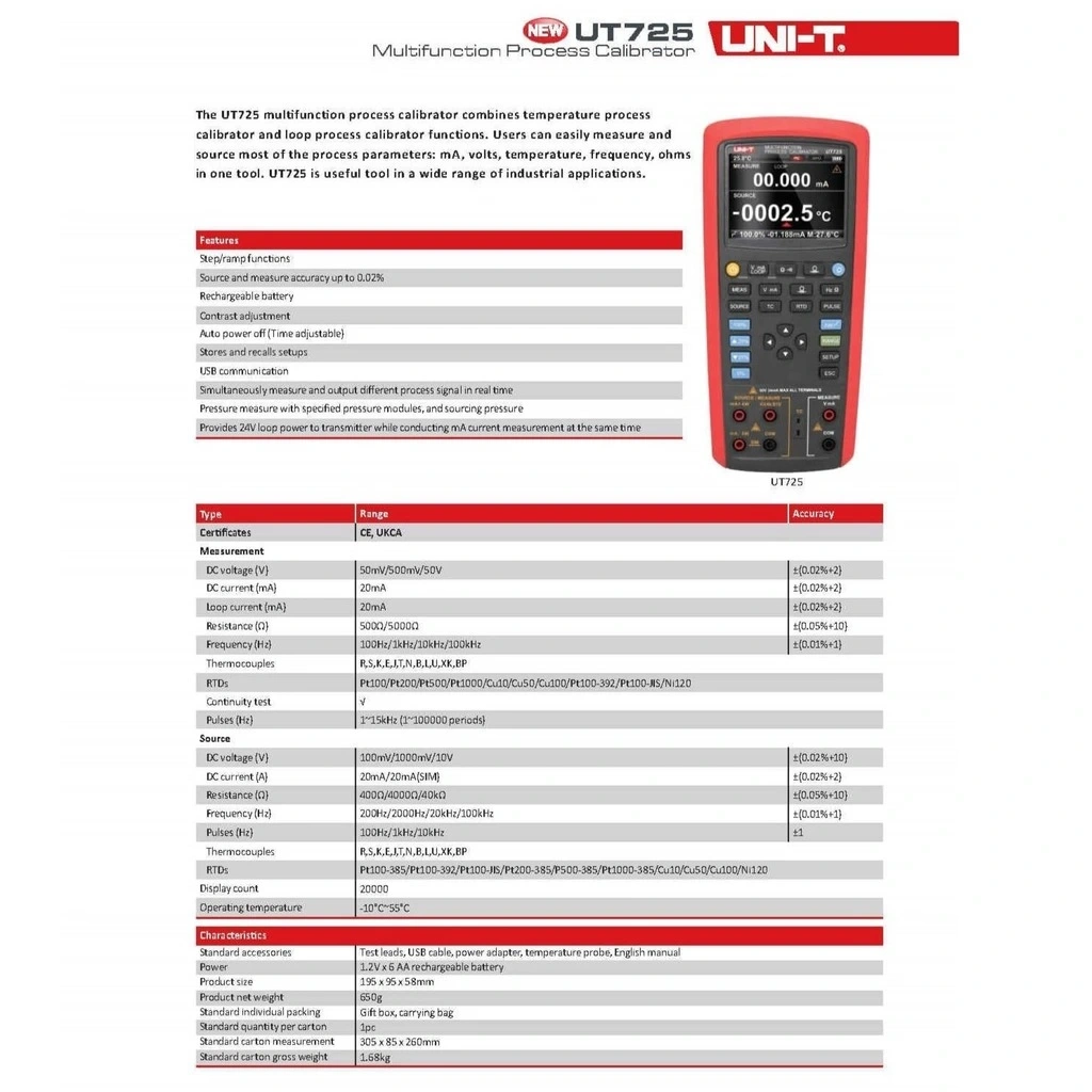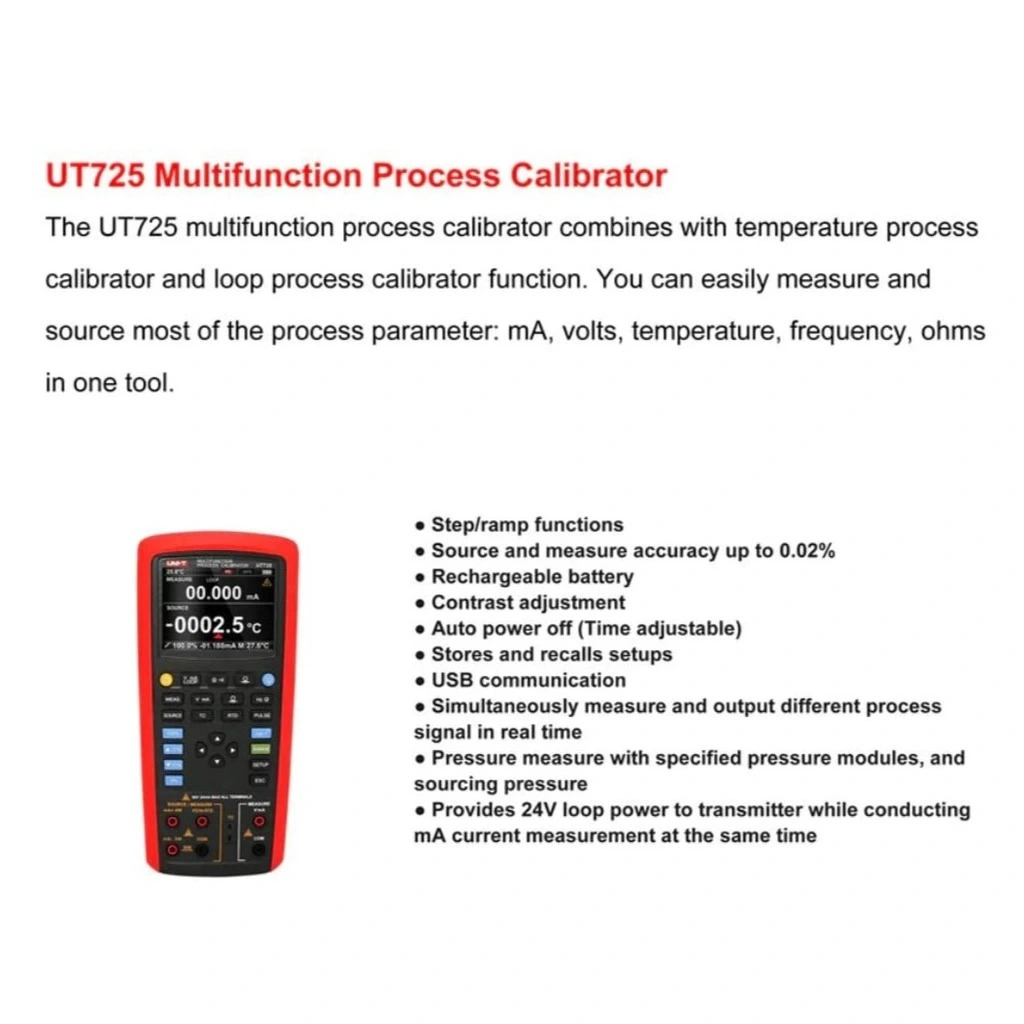 Çift yönlü 4-20mA döngü testleri, termoçift ve RTD simülasyonu ile termometre kalibrasyonu gibi özelliklere sahip olan UT725, büyük LCD ekranı ve kullanıcı dostu arayüzü ile verimli çalışma imkanı sunar. Ölçüm ve test aletleri arasında çok yönlülüğü ile öne çıkar.