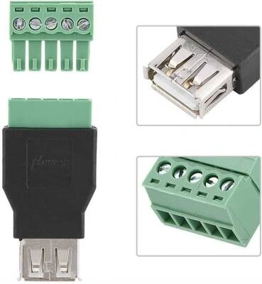 USB-A Dişi Soket - 5 Pinli Terminal Bloğu. USB Jack ile bir cihaza bağlanmanız gerekiyorsa, kendi USB host konektörünüzü, uzatma kablosunu veya özel türde kabloyu kullanarak kendi usb bağlantınızı yapabilirsiniz. Lehim gerektirmez. Terminal bloklarını açmak için küçük bir tornavida kullanın, çok telli veya sert telinizi kaydırın ve tekrar sıkın.