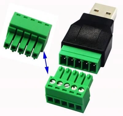 USB-A Erkek Soket - 5 Pinli Terminal Bloğu. USB Jack ile bir cihaza bağlanmanız gerekiyorsa, kendi USB host konektörünüzü, uzatma kablosunu veya özel türde kabloyu kullanarak kendi usb bağlantınızı yapabilirsiniz. Lehim gerektirmez. Terminal bloklarını açmak için küçük bir tornavida kullanın, çok telli veya sert telinizi kaydırın ve tekrar sıkın.