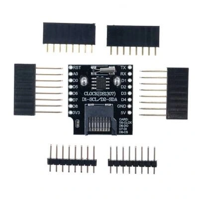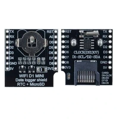 Wemos D1 Mini Data Logger + RTC DS1307 Wemos D1 Mini Data Logger + RTC DS1307.Bu kart veri günlüğü kalkanı ile verileri herhangi bir FAT16 veya FAT32 formatlı sd kartlara verileri kaydedebilir.Dahili RTC modülü ile verileri gerçek zamanlı kaydedebilir ve güç bağlantısı kesildiğinde bile verinin kaydedilmesini sağlar.RTC pilin yanlış bağlanmasına karşı korumaya sahiptir. Pinout RTC D1 - SCL D2 - SDA SD Kart D5 - CLK D6 - DO D7 - DI D8 - CS.