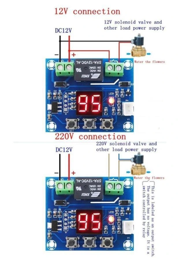 DC ve AC su pompalarıyla kullanılabilir. Selenoid vanalar ile basınçlı su hatlarını kontrol edebilir. Damla sulama sistemlerine entegre edilebilir. Sprinkler/yağmurlama sistemlerini yönetebilir. Saksı bitkileri için otomatik sulama düzenekleriyle çalışır. Bitki sulamak için tasarlanmış su depolarını kontrol edebilir.