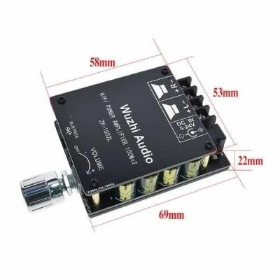 ZK-1002L 2x100W 5.0 Bluetooth Stereo Amfi Devresi, 5.0 Bluetooth sürümüne sahip 2x100 W gücünde bir amfi devresidir. Devre üzerinde 2.1mm adaptör girişi sayesinde güç beslemesi kolayca yapılabilmektedir. Yine devre üzerinde yer alan potansiyometre ile ses ayarı yapılabilmektedir. 5.0 versiyon bluetooth teknolojisi sayesinde yaklaşık 15 metre iletim mesafesine sahiptir.